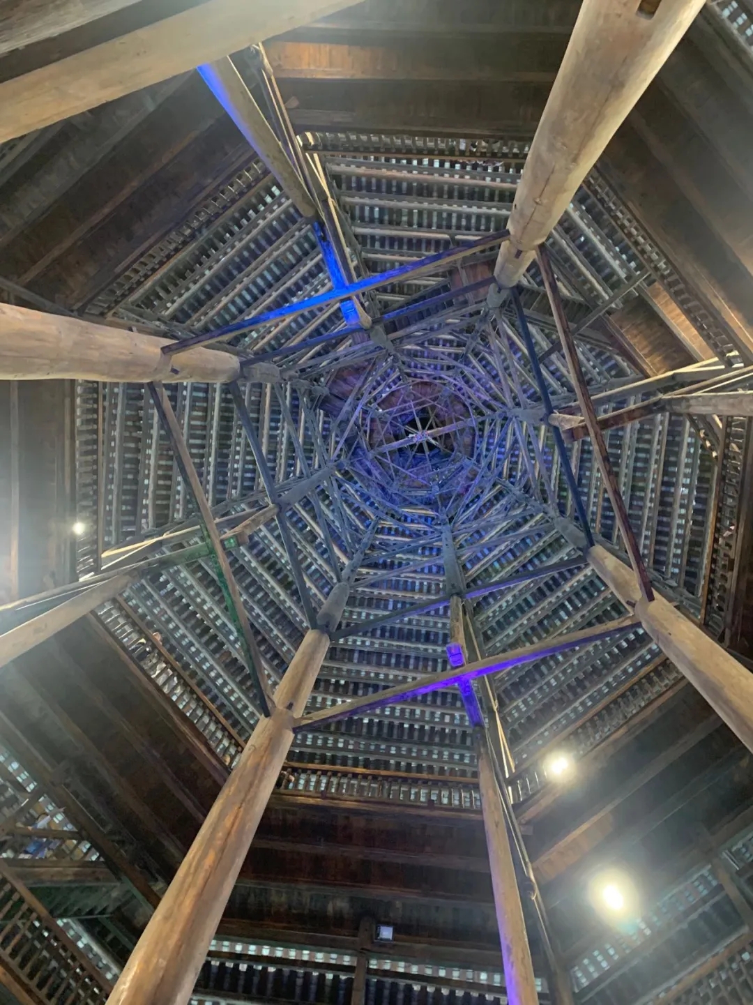 仰觀閃閃魔幻,感受侗族建設的精美藝術(shù),把疏密、粗細、剛?cè)岬韧昝赖亟Y(jié)成一個整體,展現(xiàn)侗族工匠的精美建筑技藝。不用一顆鐵釘,結(jié)構(gòu)十分嚴謹穩(wěn)固。樓內(nèi)四根杉木大柱直徑都超過70厘米,樹齡均在百年以上,這在鼓樓建筑史上是唯一的。
